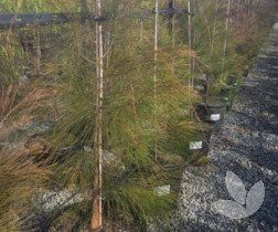 This tree has a corky light brown bark that has deep fissures.The leaves are thin green needles like a pine tree. There are female and male trees with gold male flowers in Autumn and female rounded warty cones. In Winter the branchlets turn a beautiful copper colour.