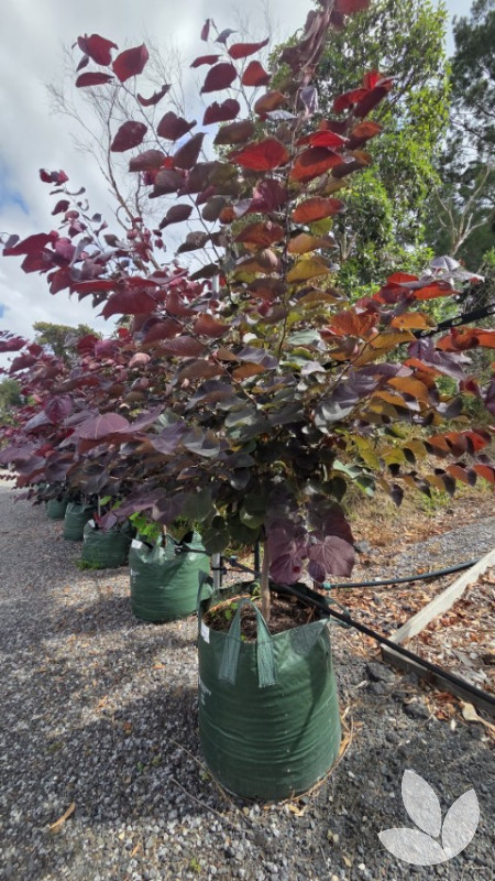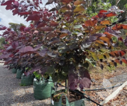 This small, attractive tree has spectacular heart-shaped, burgundy coloured leaves that continually change colour throughout the year. A rich purple in spring, the foliage transforms to green over summer, followed by a multi-coloured autumn display in tones of red, apricot and gold. The branches have a distinctive, smooth, dark brown wood which contrasts well with the blossom like pink flowers that are borne before the re-emergence of leaves in spring.