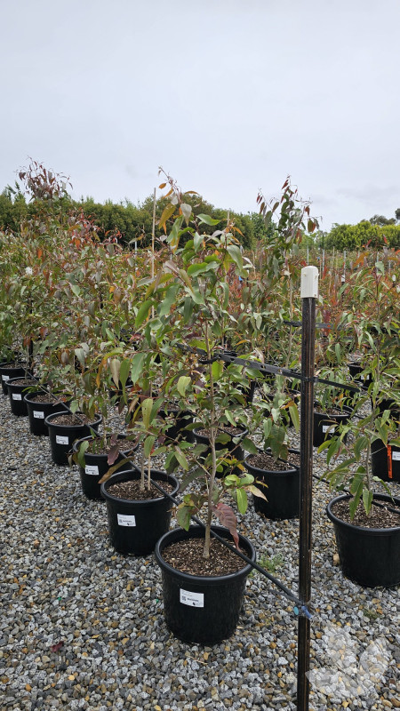 This is a stately native Corymbia (syn. Eucalyptus) which grows straight and tall. The bark sheds in summer and is smooth and cream in colour with grey spots from the older bark, providing contrast and interest with its mottled appearance. The leaves are dark green and glossy and from autumn to winter, small clusters of fragrant white flowers appear attracting birds and honeybees to the area. Note: Not to be confused with the "Red Spotted Gum" which is listed separately.