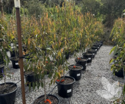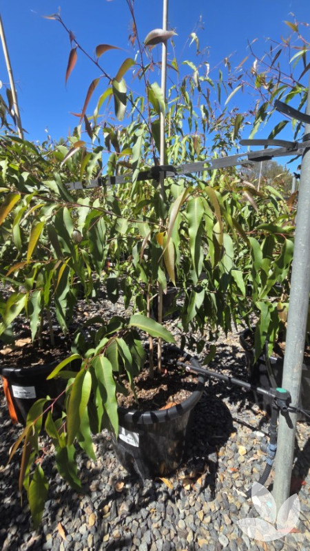 A special selection of Corymbia (syn. Eucalyptus), developed by and exclusive to Speciality Trees, from Sale in Victoria. This denser version of straight C. maculata, is smaller in height with distinctive feature bark. The spotted trunk is cream and grey. The foliage is dark green and it forms a dense canopy. It has small white flowers that are clustered together.