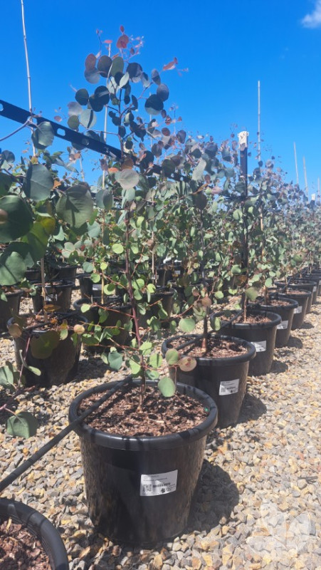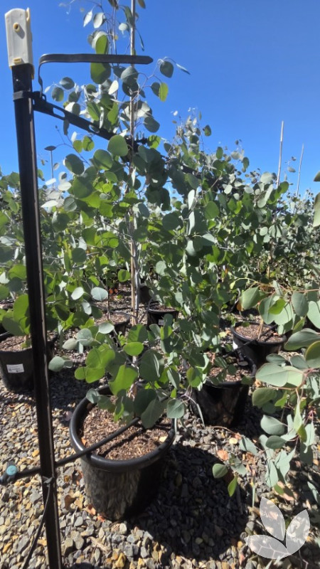 This Australian native tree grows naturally down the central tablelands of New South Wales to Victoria, and across as far as Ararat. A tough tree, it is capable of tolerating difficult, dry stony soils. Juvenile foliage is oval in shape and grey-green in colour whilst the mature, adult leaves are more ovate. The short trunk can be smooth or box-like (fissured). Flowering occurs from September to January during which small white flowers appear.