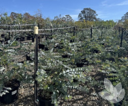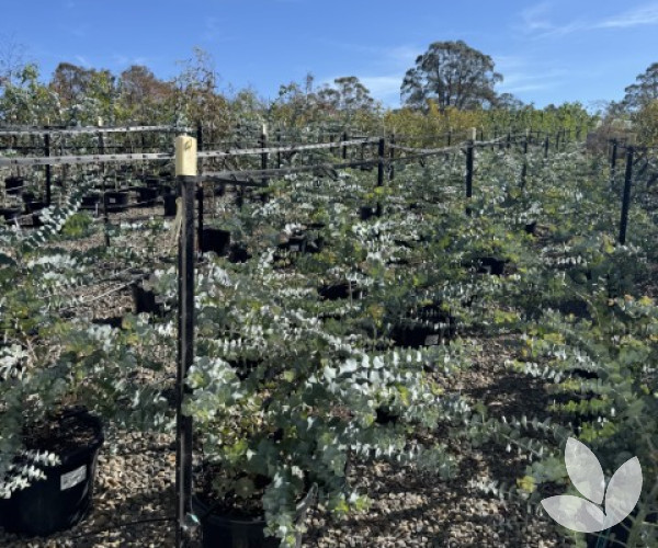 This is the shrub-form of 'Baby Blue'. It is a small-growing eucalypt usually seen as a tall, spreading shrub that retains its juvenile foliage into maturity. Young leaves, stems and inflorescences have a powdery white bloom. Foliage is strikingly silvery-grey and round in form. Cream flowers are produced between May and November and the large capsules that follow are cup-shaped. We prune the shrub-form of 'Baby Blue' to force division on the branches making it grow shorter and with wider lateral branching as shown.