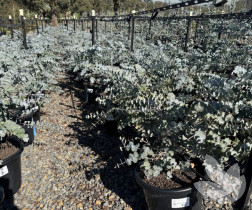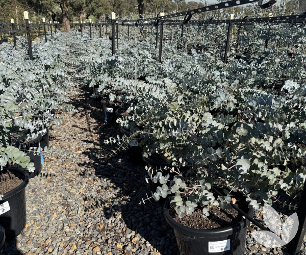 This is the shrub-form of 'Baby Blue'. It is a small-growing eucalypt usually seen as a tall, spreading shrub that retains its juvenile foliage into maturity. Young leaves, stems and inflorescences have a powdery white bloom. Foliage is strikingly silvery-grey and round in form. Cream flowers are produced between May and November and the large capsules that follow are cup-shaped. We prune the shrub-form of 'Baby Blue' to force division on the branches making it grow shorter and with wider lateral branching as shown.