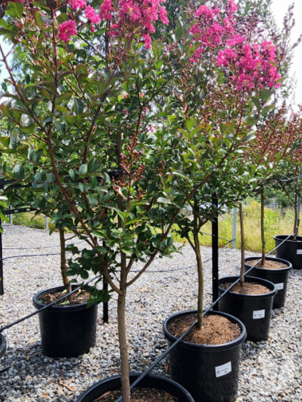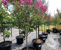 This small deciduous tree produces a spectacular display of vibrant reddish-dark-pink flowers. The clusters of flowers appear over a long period from late summer through until mid-Autumn. It has a beautiful growth habit with dark green leaves which offer further interest after the flowering period when they change to orange before falling. Bark is a rich, brown colour which reveals a lighter coloured underbark, creating a mottled effect as the tree matures. We grow this tree with a single leader.