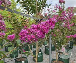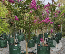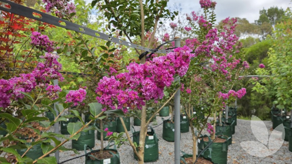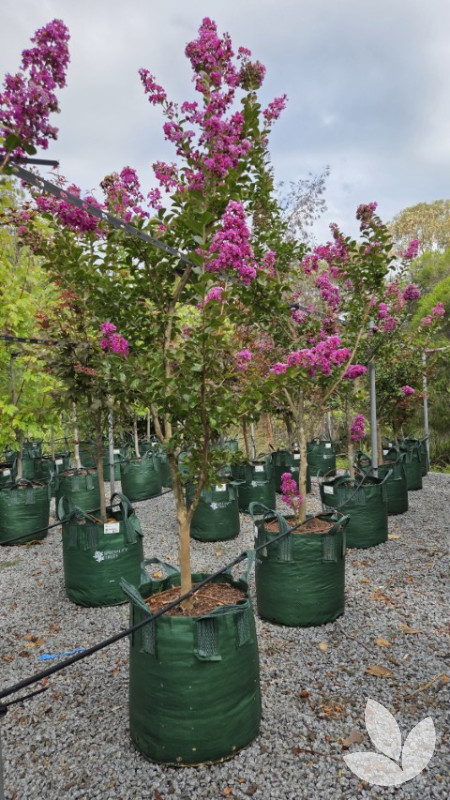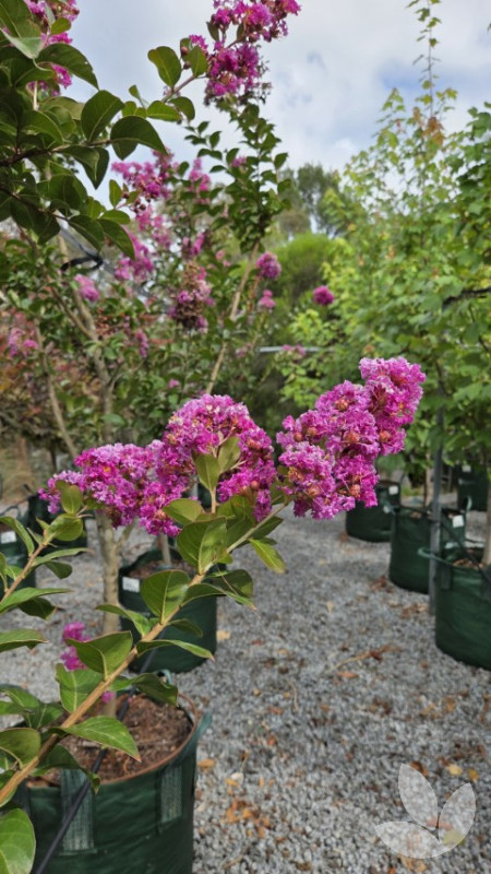 This variety can be used as a shrub or small tree. Foliage has red tinges when young and matures to a shiny dark green, with autumn foliage providing a colourful display of orange, red and maroon. Stunningly beautiful and free-flowering, masses of violet-purple flowers appear from summer through to autumn. Bark provides further interest as it peels, creating a mottled effect on the trunk. We grow this tree with a single trunk.