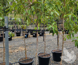 A rainforest tree native to the North-Eastern parts of Australia, this is a fast growing tree which is rarely affected by pests and diseases. Dome-like in shape, it develops a very dense foliage cover of dark green, leathery leaves providing good shade for the summer months. This variety rarely sheds limbs and has salmon coloured bark which flakes off over summer revealing orange-brown tones on the trunk. Summer also brings clusters of small white flowers whose stamens give them a decorative fluffy appearance.