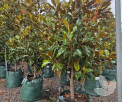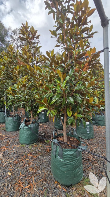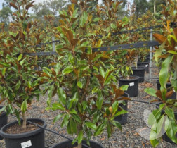 A beautiful dense tree with small mid-green glossy leaves and brown velvety underside. It produces creamy white fragrant flowers anytime during the warmer months from November through March. The tree grows denser and flowers are bigger than 'Little Gem', making this a popular alternative. It differentiates itself from other varieties by its wavy edge to its leaf and its bright pink new growth.