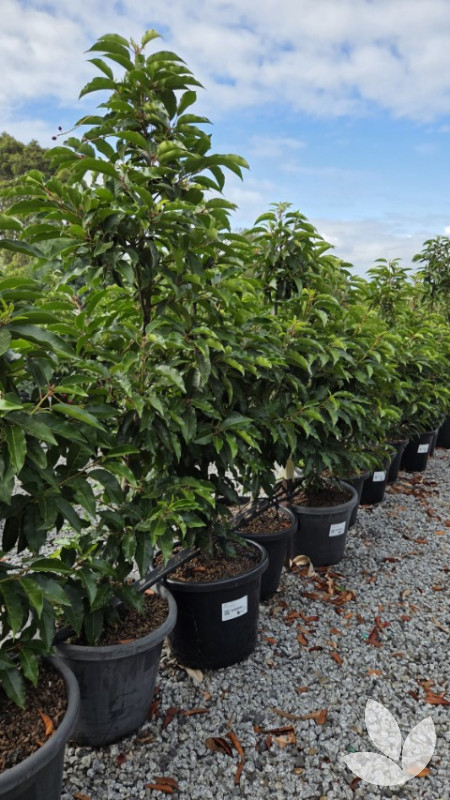 This is a very hardy evergreen shrub or small tree. Its dense habit lends itself well to hedging and screening and as it responds well to pruning, it is even ideal as a large standard. Bark is blackish-brown and the leaves are glossy, dark green and oval in shape, with new growth being lime green in colour. Small white flower heads decorate the tree in spring followed by cherry-like fruits which are green or reddish green at first, and turn dark purple or black as they ripen in late summer or early autumn.