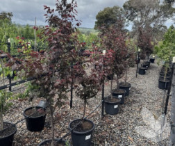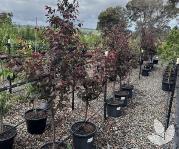 A good, vase-shaped flowering Plum tree for spring blossom (sometimes incorrectly referred to as a Cherry). This deciduous tree is relatively small growing to around 5m tall. It has slender, arching branches, double mauve-pink flowers, and reddish-purple leaves which turn purplish green in summer. An early flowering variety, it heralds the warmer days as they arrive with a beautiful display of slightly fragrant blossoms from mid-August to mid-September. Being a hybrid variety it is sterile and does not produce fruit.